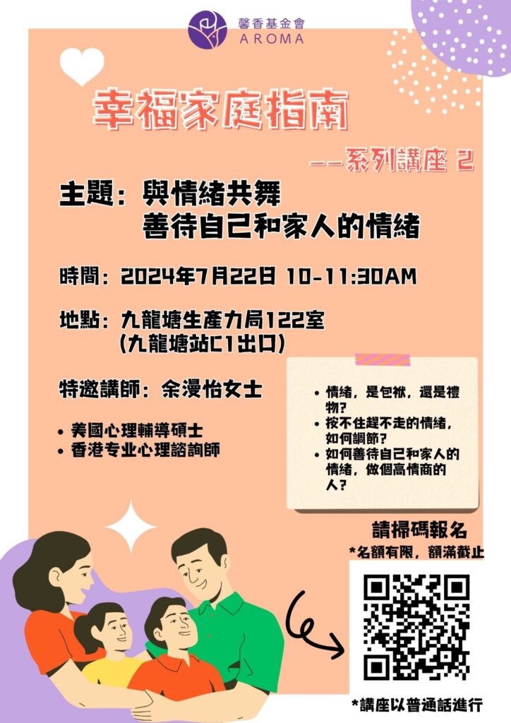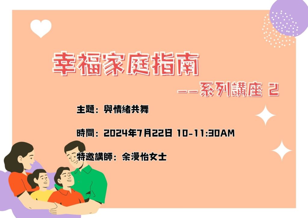 📗講座二:7月22日 10-11:30am 與情緒共舞善待自己和家人的情緒