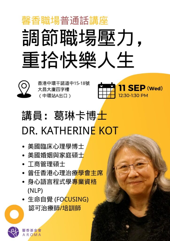 本次普通話講座誠邀國際知名心理導師Dr. Kot葛琳卡博士,帶您走進自我壓力評估的世界,為您提供切實可用的應對策略和心理調適技巧。讓我們一同驅散職場的重重陰霾,重燃生活的熱情,再次勇敢地張開雙臂,擁抱快樂的人生!
