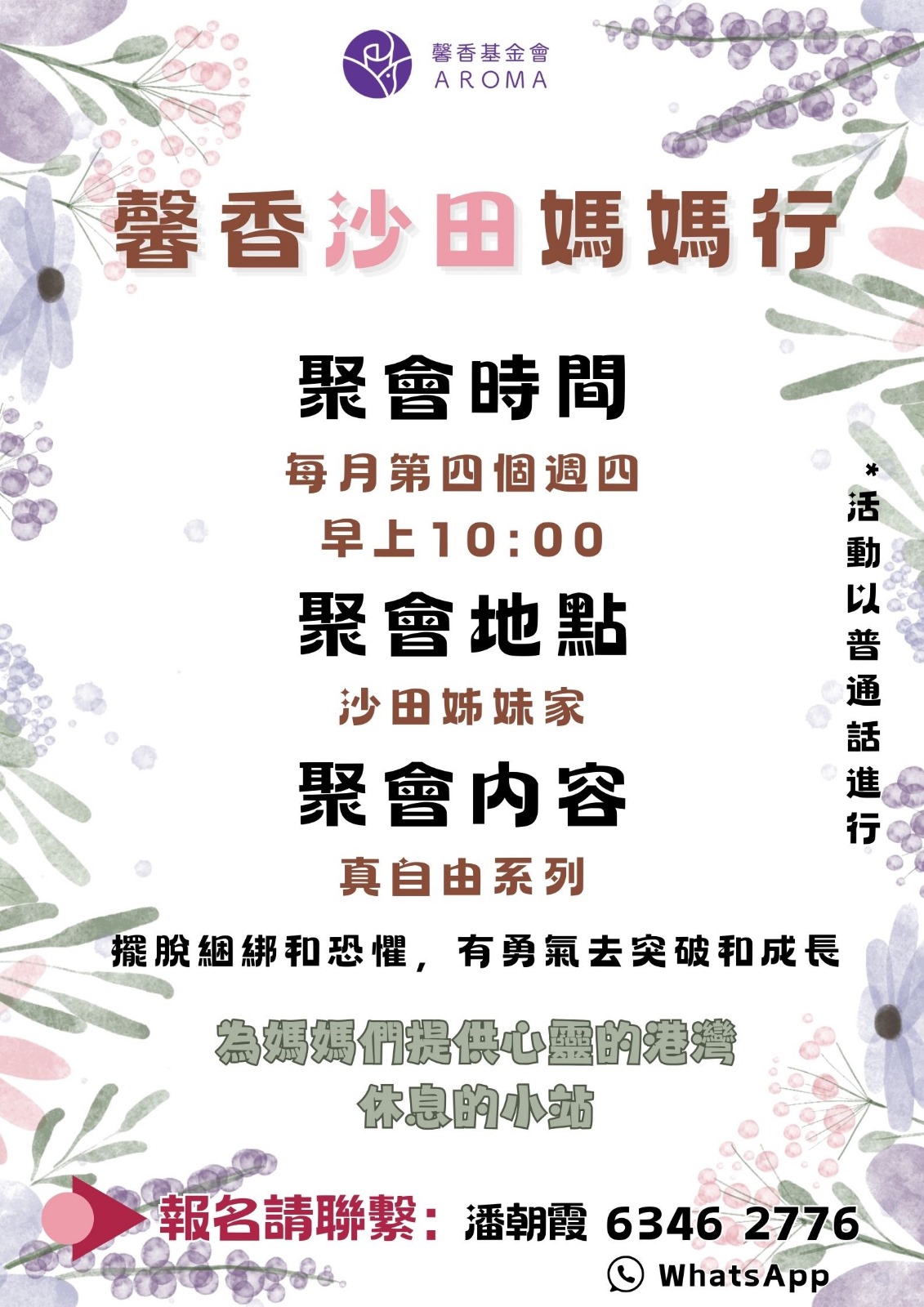 同樣從10月開始,在沙田一姊妹家舉辦的媽媽行,在每月第四個週四早上10:00舉行真自由系列分享,为各位媽媽们提供一個心靈的港灣與休憩的小站。