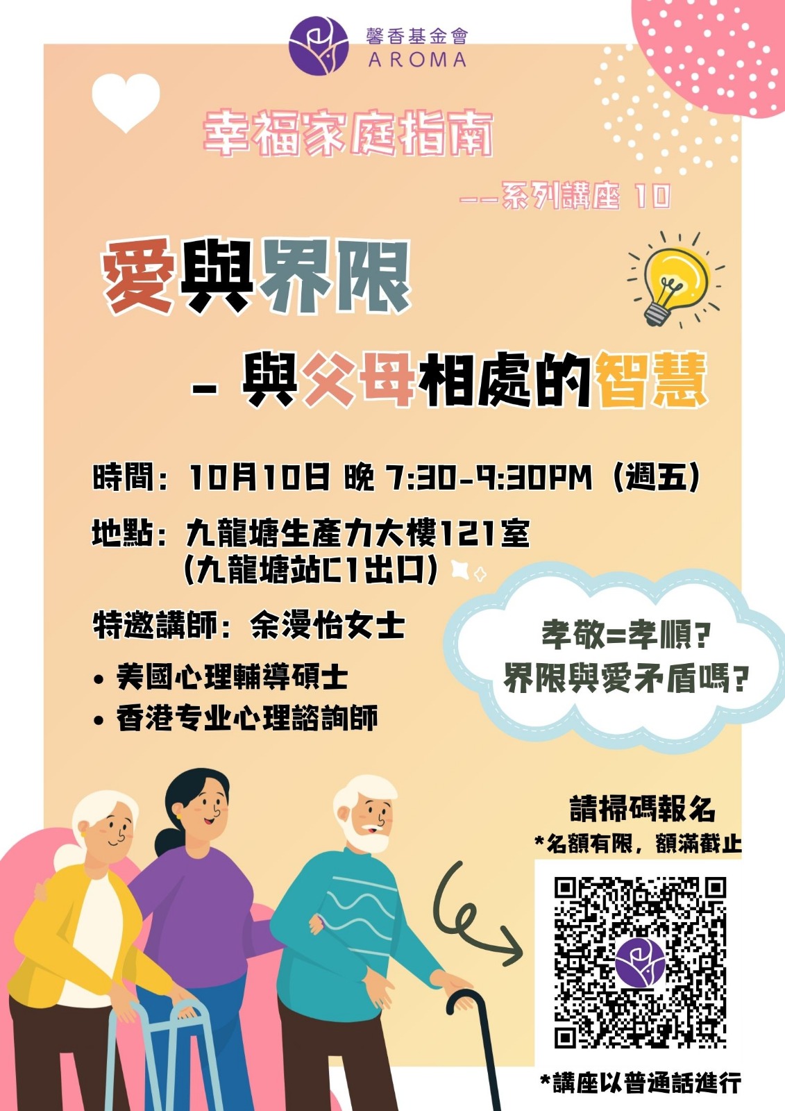 誠摯邀請您參加這場家庭講座,由心理輔導師漫怡女士帶領我們探索如何在親情中找到平衡,學習既不失愛,也不失自我。