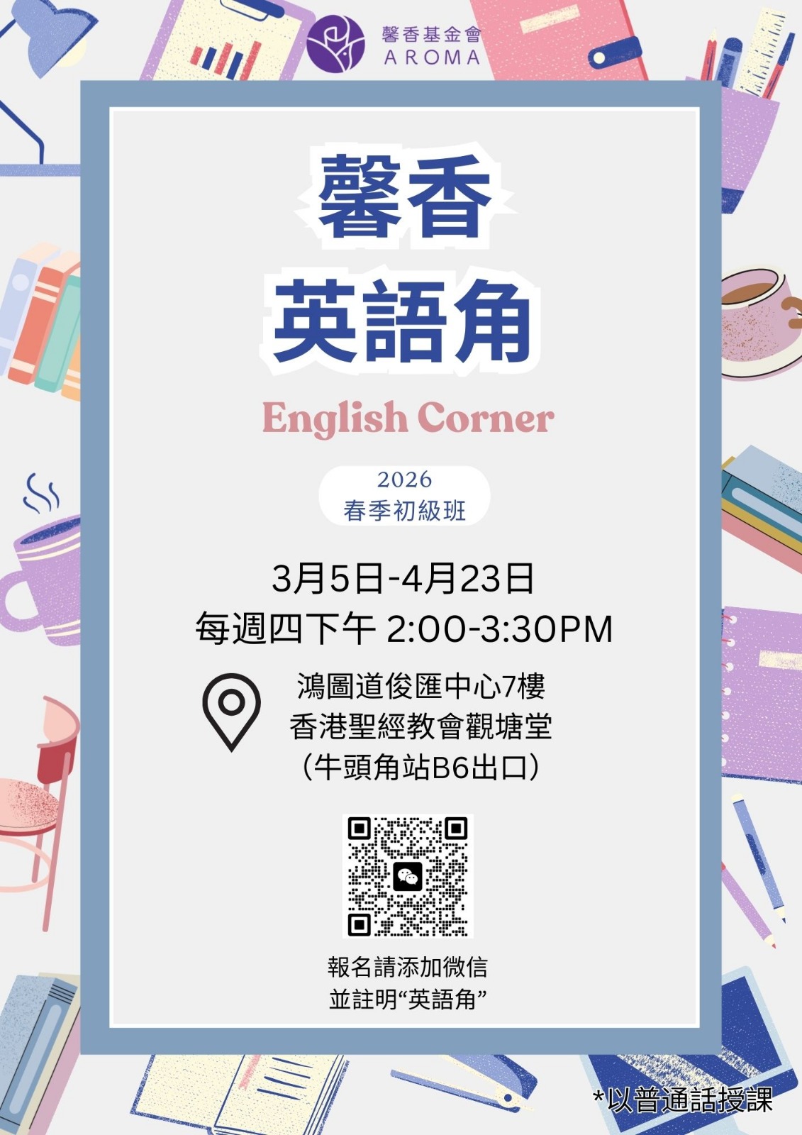 你是否曾對英語既感到陌生,又充滿好奇與嚮往?是否渴望在一個輕鬆、友善的環境中,踏出學習英語的第一步?馨香基金會誠意推出「英語角春季初級班」,專為零基礎學員設計,從貼近生活的主題出發,逐步引導至日常會話,陪你一起自信開口,走進英語的廣闊天地。